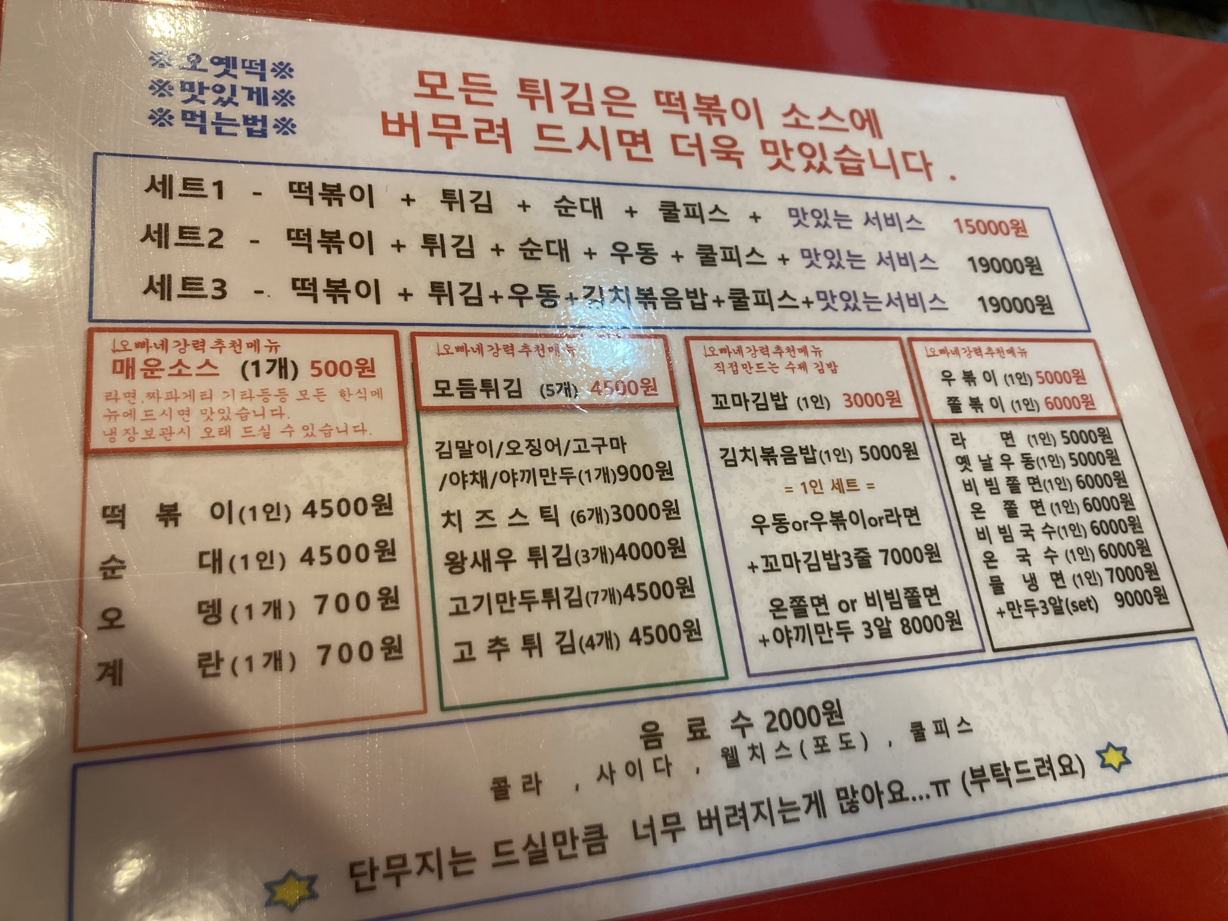 오빠네 옛날 떡볶이 메뉴, 여러가지 메뉴가 있지만 세트메뉴가 눈에 띄었다.